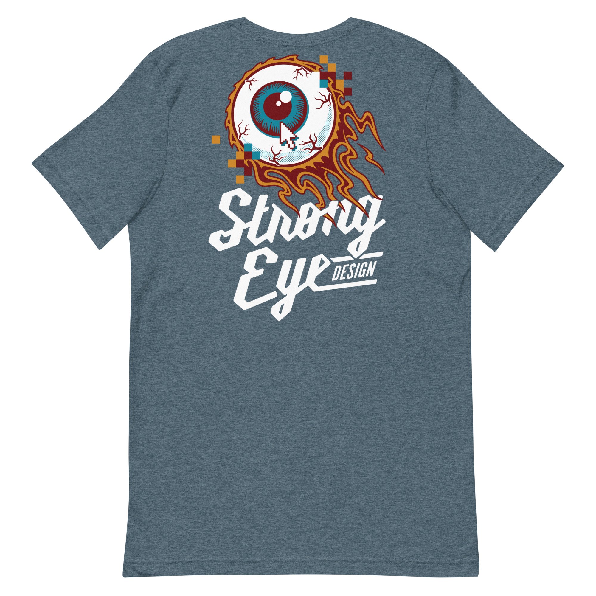 A bold fusion of digital precision and raw creative energy. This tee features the signature flaming eyeball graphic, pixelated and pulsing with design power, anchored by a retro-styled cursor and blazing in vector glory. The front left chest sports a clean mini mark, while the full-back explodes with the complete artwork: a fiery symbol of vision, strength, and relentless artistic drive.