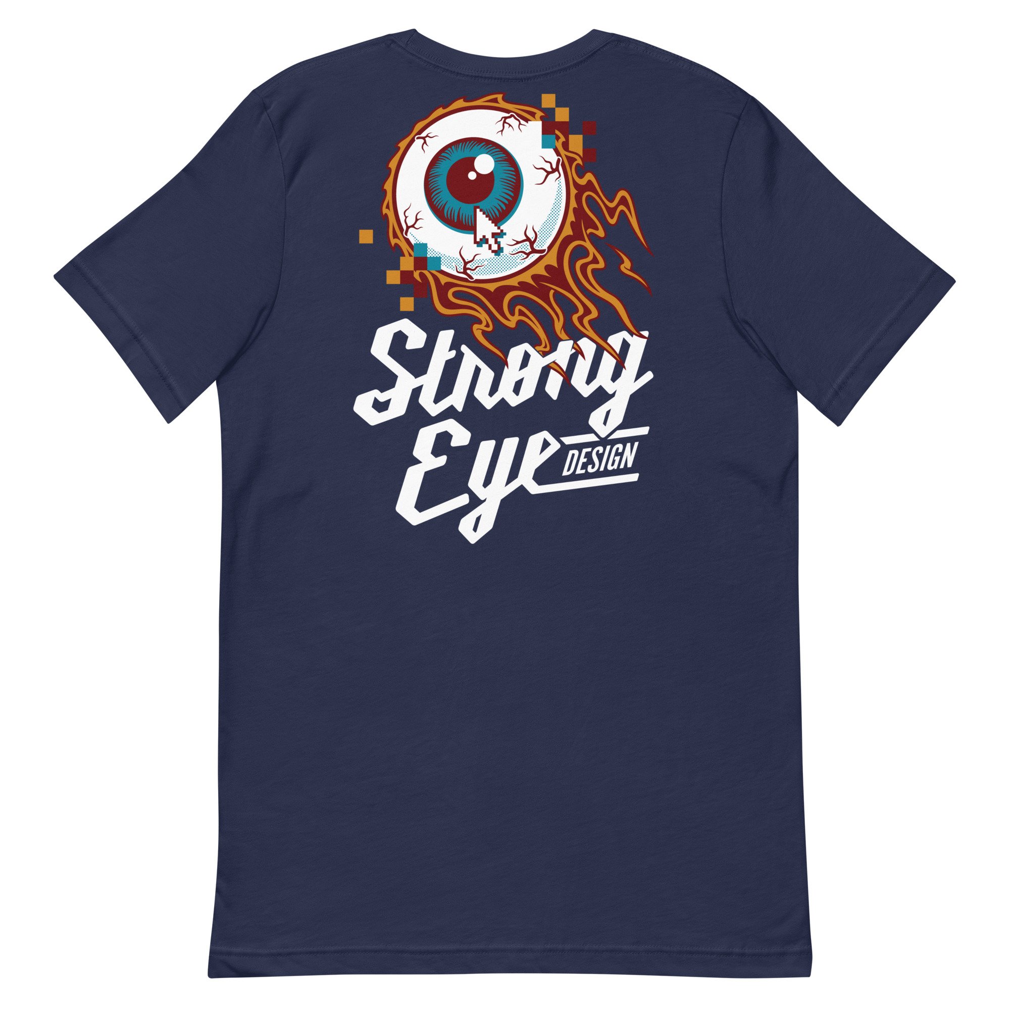 A bold fusion of digital precision and raw creative energy. This tee features the signature flaming eyeball graphic, pixelated and pulsing with design power, anchored by a retro-styled cursor and blazing in vector glory. The front left chest sports a clean mini mark, while the full-back explodes with the complete artwork: a fiery symbol of vision, strength, and relentless artistic drive.